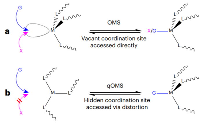图1:(a) OMS具有空缺配位点;(b) qOMS的配位点被隐藏