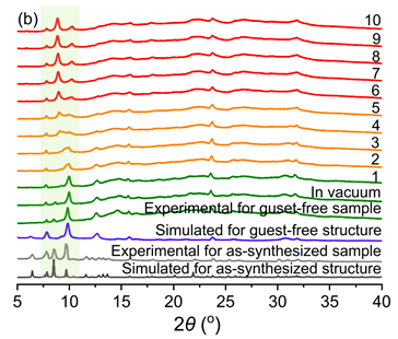图2:MAF-2Fb的(a) 195 K CO吸附等温线及(b)原位PXRD图谱