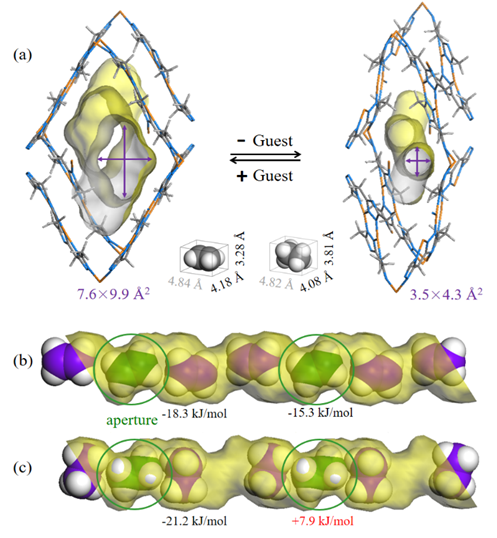 图1. (a) MAF-42客体诱导的可逆结构转变和(b, c) GCMC模拟的主客体结构