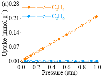 工业C2H4/C2H6分离在低温和高压下进行,是一个高能耗过程。理论上,吸附分离可以更加节能,而分子筛效应被认为是理想的分离机理。不过,分子筛孔径较小,通常与客体(包括水)存在强吸附作用,在常压或更低压力下就可以达到吸附饱和,这限制了其在工业常见的高压环境中的应用。此外,大多数分子筛(如沸石)都具有高亲水性,因此气体混合物需要高能耗的预干燥处理。