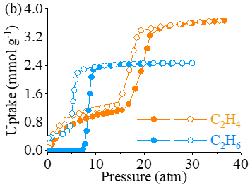 图2. MAF-42的(a)常压和(b)高压C2H4/C2H6等温线