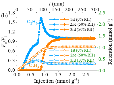 图3. MAF-42的(a)水吸附等温线及接触角和(b)干燥/潮湿条件下的高压C2H4/C2H6穿透曲线