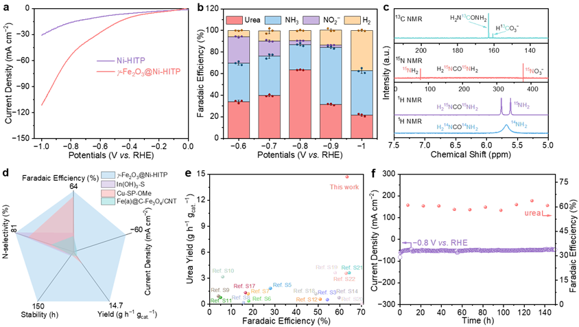 图3:γ-Fe2O3@Ni-HITP用于共还原CO2和NO3−的性能测试。a, γ-Fe2O3@Ni-HITP的LSV曲线。b, γ-Fe2O3@Ni-HITP作为催化剂时urea,NH3,NO2−和H2的FE。c, urea的NMR谱。d, γ-Fe2O3@Ni-HITP和几例有代表性电催化剂用于共还原CO2和NO3−合成urea的性能对比。e, 文献报道的用于共还原CO2和NO3−合成urea的电催化剂在urea产率和FE方面的对比。f, −0.8 V vs. RHE电位下150小时稳定性测试。