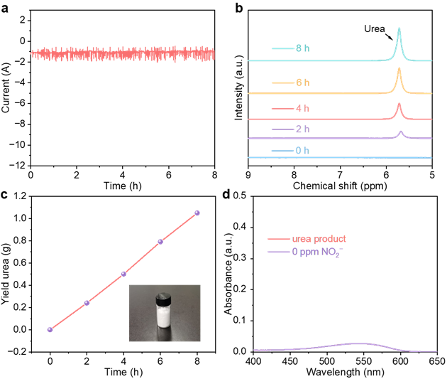 图4:使用具有较大窗口(5*5 cm2)的流动池时电催化CO2和NO3−共还原合成urea的性能。a, CO2饱和的0.1 M KHCO3 + 0.04 M KNO3电解液中,催化剂负载量为0.36 mg cm−2,−0.8 V vs. RHE时8小时性能测试i-t曲线。b, 不同时间urea产物的1H NMR谱图。c, 不同时间的urea产量。插图:8小时产生的urea。d, 纯化后的urea产物和0 ppm NO2−的紫外检测结果,证明提纯后urea产物中无NO2−。