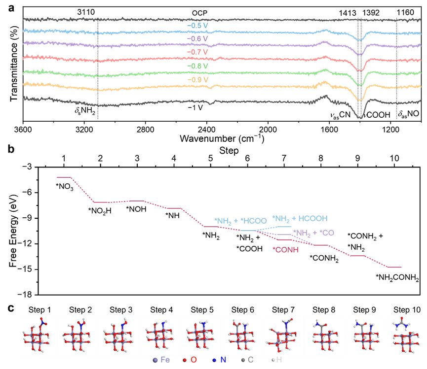 一方面,通过多组对照实验,揭示了催化过程中,γ-Fe2O3是催化活性中心,Ni-HITP不仅起到载体作用,其较高的电导率对于提升电催化反应速率起到关键性作用。另一方面,进行Operando ATR-FTIR测量来进一步了解C−N偶联和尿素合成的微观机制。结果表明,γ-Fe2O3中存在一对相邻的双核铁,该双核铁位点能够促进关键中间体*NH2和*COOH之间的C−N偶联。通过PDFT计算也表明,当*NH2中间体存在时,CO2还原得到的中间体*HCOO或*COOH都倾向于跟*NH2偶联而不是进一步还原和脱附得到HCOOH,因此能高效的合成尿素产物,这为尿素的合成提供新的理论见解。