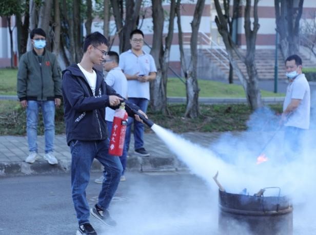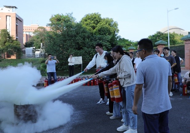参与活动的师生认真仔细地学习消防器材使用方法并积极参与实操演练