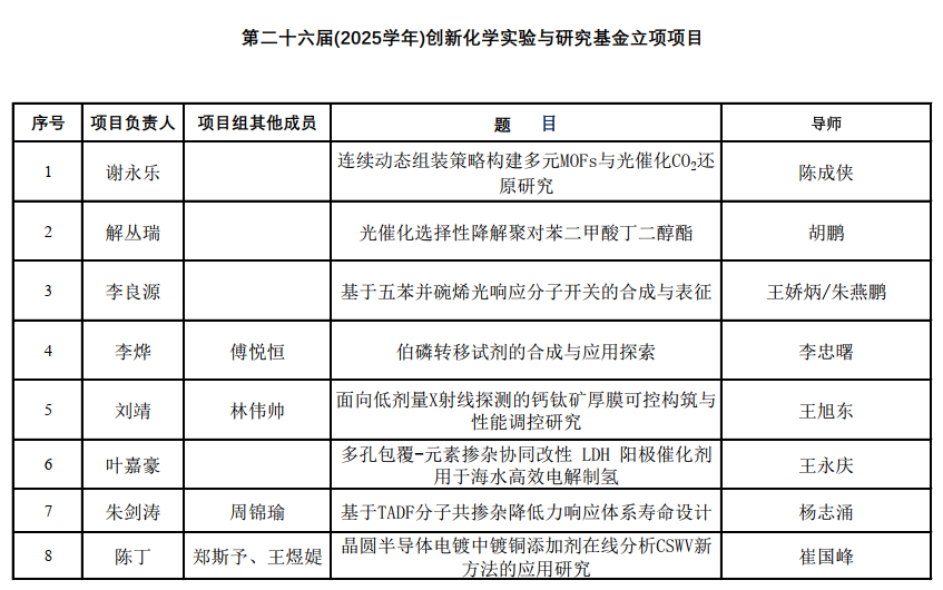 根据英国威廉集团化学实验教学中心《关于申请“第二十六届(2025学年)创新化学实验与研究基金”项目的通知》文精神,经学院专家评审,决定对《连续动态组装策略构建多元MOFs与光催化CO2还原研究》等8个项目予以立项,资助经费5000元/项目。具体的名单见下表或附件。