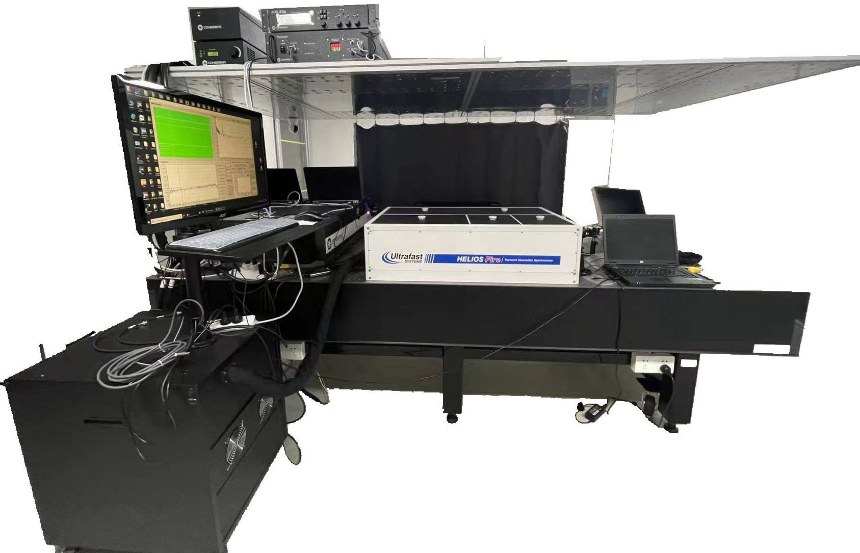 | 主要参数 仪器探测光可选波段为 320 – 650 nm,420 – 780 nm ,760-840nm,820 – 1600 nm 。HELIOS模式:时间窗8ns,延时分辨率14fs;EOS扩展模式:时间窗400 μs,延时分辨率100 ps。 |