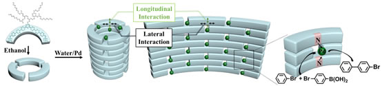 相对于均相催化,非均相金属催化在环境保护和经济节能方面具有较多优势受到了众多研究者的关注。但是,金属催化剂在反复进行的反应过程中的聚沉。为此,利用多孔高分子、树状聚合物、硅氧化合物、以及MOFs等介孔材料阻止金属团聚,稳定金属催化能力。虽然利用各种技术制备了具有微孔、介孔、大孔性质的有序或无序的多孔材料,提高金属催化性能,但是,大多数在水或有机媒介中分散性差、结构不稳定、容易聚沉。并且,非均相反应最大的缺点是无法控制反应的进程,一担开始反应将一直进行至结束。作为杂化的芳香烃的衍生物,刚柔两亲性分子通过组装极易形成有序的多孔结构,在水或有机溶剂中具有良好的分散性和稳定性。