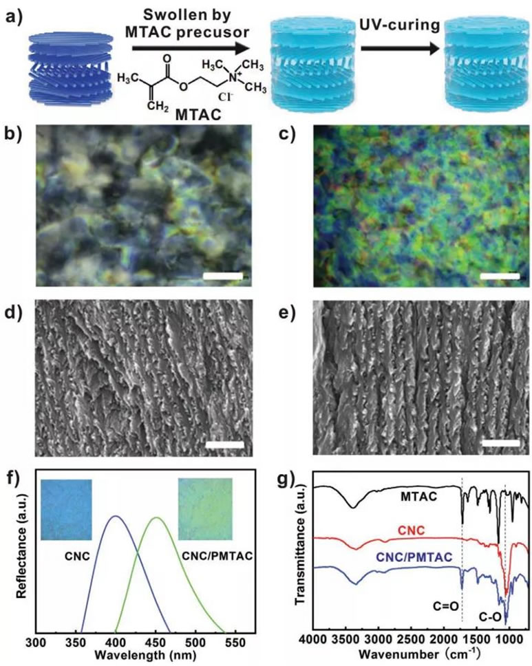 图1.(a)通过溶胀后交联固化工艺制备CNC/PMTAC复合膜的示意图;(b-c)在原始CNCs膜和CNC/PMTAC复合膜的偏振光学显微镜下光学图像;(d-e)原始CNCs膜和CNC/PMTAC复合膜的SEM图;(f)原始CNCs膜和CNC/PMTAC复合膜的反射光谱。插图:相应样品的光学图像;(g)甲基丙烯酰氧基乙基三甲基氯化铵(MTAC),CNC和CNC/PMTAC复合材料的FT-IR光谱。