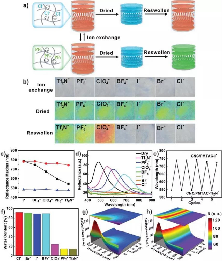 图2. (a)CNC/PMTAC-X复合膜的抗衡离子再溶胀行为示意图;(b)与不同的抗衡阴离子在水中交换(上),干燥(中间)并再次浸泡在水中(下)时,CNC/PMTAC膜的光学图像;(c)与不同的离子交换(红色线),干燥(蓝色线)并最后再次浸入水中(黑色线)时,CNC/PMTAC膜的反射率最大值;(d)具有不同抗衡阴离子的CNC/PMTAC膜浸润状态下的反射光谱;(e)在I-和Tf2N-之间的5次连续交换时记录的反射最大值;(f)具有不同抗衡阴离子的PMTAC的饱和水含量;(g)从t = 0 s开始时,浸润状态下,CNC/PMTAC-Cl-的时间分辨反射光谱;(h)从t = 0 s开始时,浸润状态下,CNC/PMTAC-PF6-的时间分辨反射光谱;