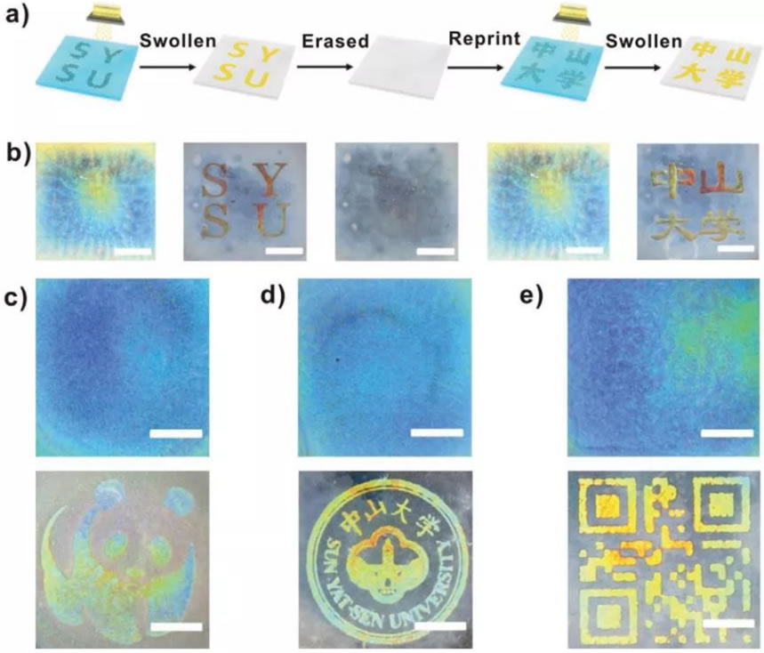 图3.(a)在CNC/PMTAC膜上创建不可见的图案的示意图;(b)在CNC/PMTAC膜上创建不可见的图案的喷墨打印和擦除过程的光学图像;(c-e)通过喷墨打印在CNC/PMTAC膜上实现隐藏和显示的图案。