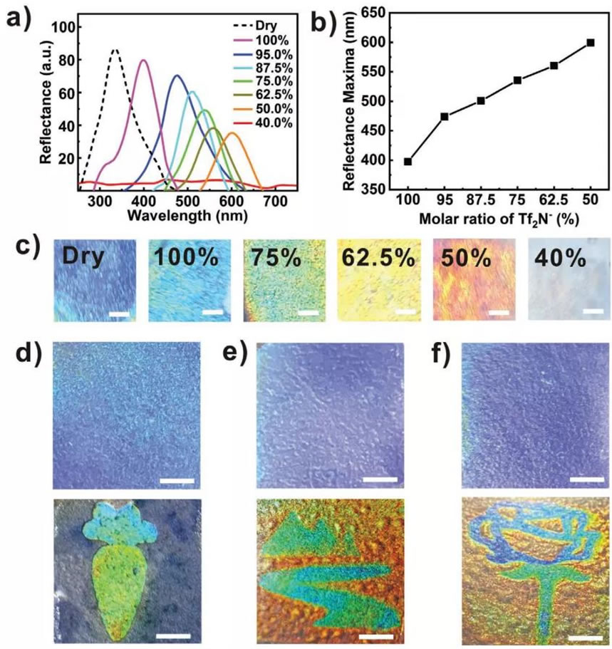 图4. (a)用Tf2N- / BF4-混合溶液进行喷墨打印的CNC/PMTAC膜的反射光谱(当浸润水中时),插图的数字表示Tf2N-的摩尔比,盐的总浓度固定为200 mm;(b)CNC/PMTAC膜浸润在具有不同比率的Tf2N-抗衡阴离子溶液时的反射率最大值;(c)浸润状态下,以不同比例的Tf2N- / BF4-抗衡阴离子组合盐溶液进行喷墨打印的CNC/PMTAC膜的光学图像;(d–f)浸入水中时处于干燥状态的不可见图案(上方)和处于彩色状态(下方)。