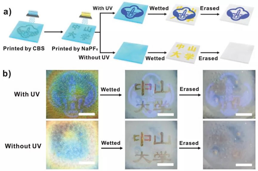 图5. 通过喷墨印刷在单个CNC/PMTAC膜上的可润湿响应汉字和荧光水印的独立编码信息的(a)示意图和(b)光学图像。