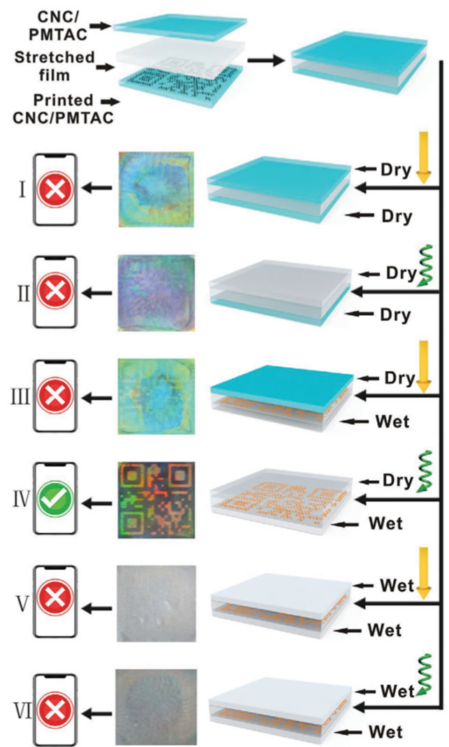 图6. “三明治结构”设计的加密和解码示意图和光学图像;该三明治设计由两张由透明单向拉伸薄膜分开的CNC/PMTAC薄膜形成,二维码只能在右手CPL下,底层浸润性,而顶层干燥的情况下识别。
