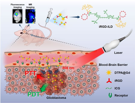 因此,帅心涛课题组开发了一种新型的水溶性的分子探针。如图所示,在合成的带有羧基的近红外荧光分子吲哚菁绿(ICG)的衍生物的基础上,将 T1加权的MR造影剂Gd-DTPA和靶向环肽iRGD连接上去,得到靶向分子探针。肿瘤归巢和靶向肽iRGD的加入赋予了探针同时靶向血管内皮细胞和肿瘤细胞的能力。由于所制得的分子探针尺寸极小,而且 iRGD 靶向肽能够介导脑血管表面的αvβ3整合素受体的转胞吞作用,因而这个分子探针在脑胶质瘤早期的时候就能高效地穿过血脑屏障,靶向肿瘤组织,进行 MR/荧光双模态成像。同时, ICG 片段能够在近红外激光的照射下产生光热和光动力效应,杀死肿瘤细胞。体内及体外的实验研究表明,该分子探针对原位荷瘤小鼠实现了较好的治疗效果。相关结果发表在Advanced Functional Materials(Advanced Functional Materials, 2020, 30, 1909117)上。我院帅心涛教授和孙逸仙纪念医院放射科沈君主任为通讯作者,博士生李博为第一作者。