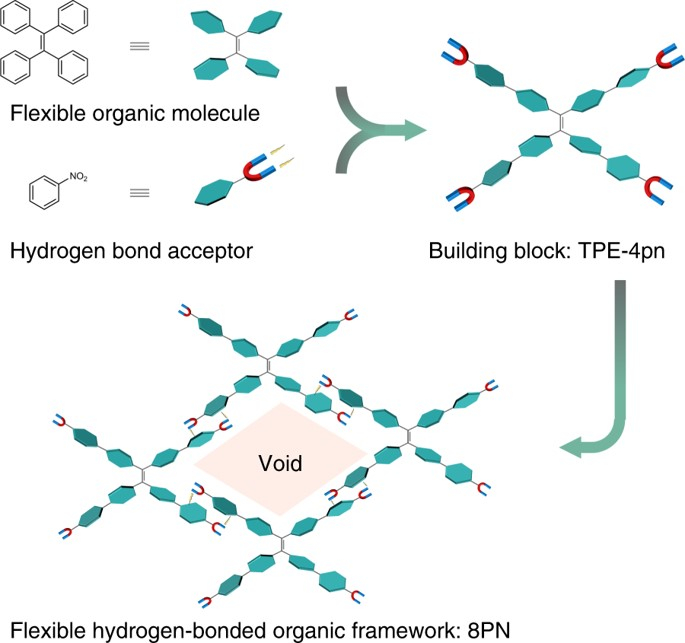 2019年,该研究团队设计合成出多硝基取代的四苯乙烯衍生物并构建出具有永久孔隙率的柔性HOF。获得了9个具有不同孔结构的HOF单晶,实现了晶胞中孔隙率从4.4%到33.2%大范围调节,并伴随着发光性质变化。此外,还获得了一系列高质量的共晶,可以包含形状、大小、聚集状态甚至数量各不相同的客体,表明该HOF结构可以通过调节分子构象和组装形式来适合不同的客体分子。这种HOF结构的柔性有望丰富了现有多孔材料的性能及应用。
