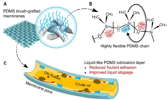 类液体表面是通过共价键接枝在固体表面上的高度柔顺性的分子刷层,如聚二甲基硅氧烷。这些高度柔性的分子一端接枝在固体表面上,另一端可以自由运动,整体表现出类似液体的性质。田雪林教授课题组采用简单的热激活平衡反应制备了类液体分子刷修饰的不锈钢网膜(LPDMS-SSM)。如图1所示,高度柔顺的类液体分子刷可以降低油污在表面的接触角滞后和侧向附着力,从而降低了污染物在膜孔道内的吸附;同时高度柔性的类液体分子刷可作为润滑层促进界面滑移。两者协同,从而提高了膜的抗污染性能和油的穿透通量。