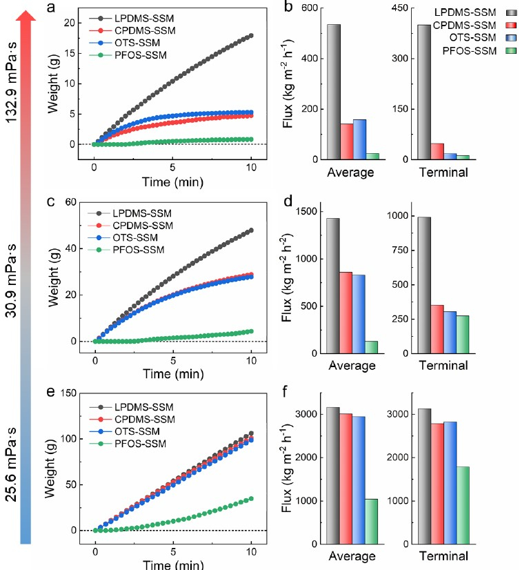 为了说明类液体表面特性在膜分离中的作用,将类液体改性不锈钢网膜与三种常用的表面改性方式改性的的不锈钢网膜做了对比,包括交联聚二甲基硅氧烷(CPDMS-SSM)、烷基链(OTS-SSM)和全氟烷基链(PFOS-SSM)。通过对比测试这四种表面改性策略对原油的穿透通量发现,LPDMS-SSM 膜对原油(黏度为132.9 mPa·s)的穿透通量远高于其它三种表面改性膜(CPDMS-SSM、OTS-SSM 和PFOS-SSM)(图2)。从质量-时间变化曲线的斜率可以看出,CPDMS-SSM、OTS-SSM 和PFOS-SSM 膜在原油穿透的过程中都出现了明显的通量下降,所观察到的通量下降很可能是由原油中的高黏性污染物(如蜡和沥青质成分)导致的膜污染所引起的。与另外三种膜相比,LPDMS-SSM在原油穿透测试过程中其穿透通量下降程度更小,证明了类液体改性膜具有更好的防污性能和液体穿透性。
