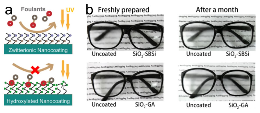 防雾涂层在潮湿环境中时可以防止透明基材上出现雾化和模糊等情况,具有巨大的应用潜力。然而,大多数防雾表面的耐用性较差,由于对环境中污染物吸附或风化(例如紫外线照射)而在短期内失去防雾性能。针对该问题,田雪林课题组制备了一系列两性离子和羟基化的超亲水涂层,系统对比研究了其在恶劣条件下的长期防雾性能,包括将该涂层暴露于醋酸蒸汽的加速污染测试、紫外线照射等测试。研究表明,所制备的两性离子涂层由于两性离子部分的化学惰性和稳定性,在所有测试条件下显示出比羟基化表面显著增强的耐久性。通过将两性离子涂层和纳米级粗糙度结合在一起,可以进一步提高防雾表面的使用寿命。使用用这种纳米结构的两性离子涂层处理后的镜片,即使在储存长达210天后仍能保持良好的防雾性能。