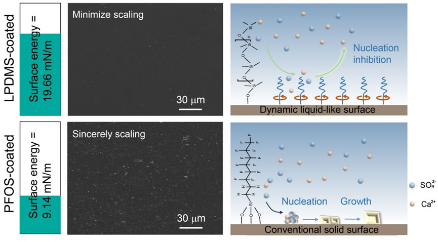 结垢是油田生产、换热器、锅炉、工业水处理、海水淡化等众多行业面临的重大问题,然而目前常用的防垢方法存在防垢效率低、不环保、涂层不稳定等诸多问题,研究能有效抑制垢形成的高性能抗垢表面对于实现低能耗、环境友好的抗垢应用具有重要意义。针对上述问题,田雪林教授团队提出了一种独特的类液体表面功能化高效防垢策略。通过在表面接枝极低玻璃化转变温度的线性聚二甲基硅氧烷(LPDMS)分子刷,获得具有类液体特性的功能化表面,使得表面抗垢效果显著提高。