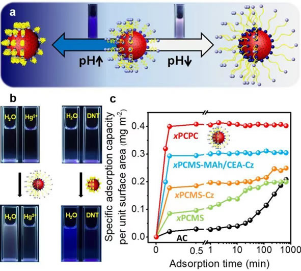 图1. 具有化学环境敏感、可视化检测、超快吸附以及简易再生等功能的一体化多孔高分子吸附剂