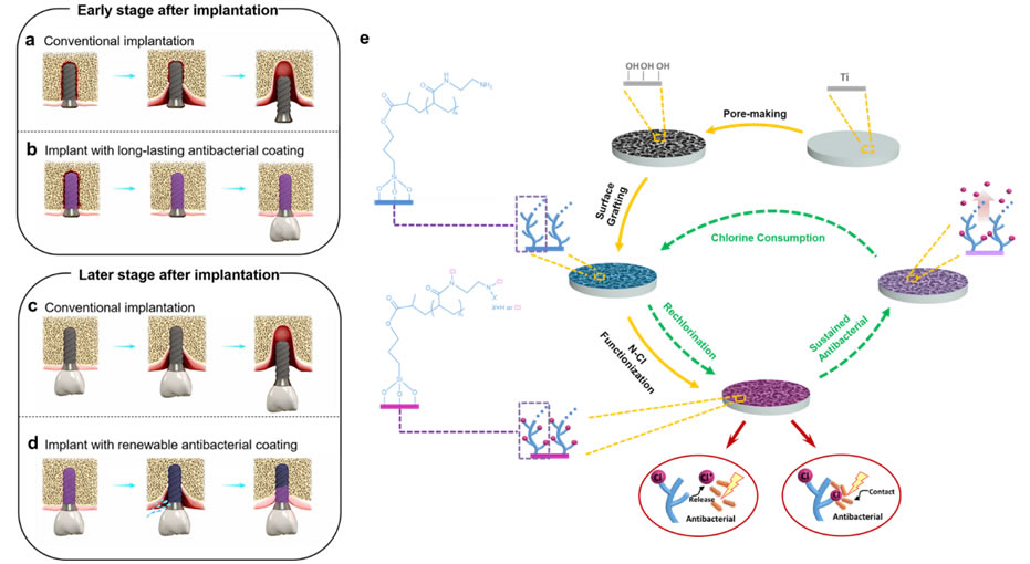 种植术后早期感染和种植体周围炎是最常见的导致种植失败的种植体周围组织感染性疾病。目前通过物理吸附、氢键等方法将抗菌剂结合到钛表面形成的抗菌涂层牢固程度较低,抗菌成分析出快,因此抗菌持续时间短,难以达到有效预防种植术后早期感染的目的(图1a)。种植体周围炎是种植修复后由于局部环境中微生物生态失衡导致的一种常见生物学并发症。现有种植体表面抗菌涂层的抗菌活性在种植修复远期已基本消失,无法起到控制和治疗种植体周围炎的作用(图1c)。