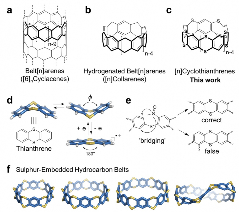作为单壁碳纳米管的部分侧壁结构,碳氢纳米环带特别是其中的锯齿型碳纳米带及其氢化产物的成功构筑可为碳纳米管的精准合成提供一种自下而上的新策略。自1954年锯齿型碳纳米带的设想结构被提出以来,它的合成研究一直吸引着众多的化学家,直到最近才实现了突破。在碳纳米环带结构中引入杂原子(N,O等)不仅可以克服环带分子合成过程所中面临的高张力问题,同时也赋予了纳米环带新的物理和化学性质,为环带分子合成提供了一种新的思路。在前期研究的基础上,william威廉英国朱克龙教授研究团队合成了一系列具有噻蒽(thianthrene)构筑单元的硫杂碳氢纳米环带——[n]环噻蒽([n]cyclothianthrene),简称[n]CT。