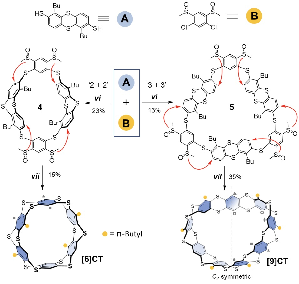 为了实现硫杂碳氢纳米环带的精准构筑,研究者采用了“模块化”合成策略,通过先合成无张力的单桥连大环前驱体再并环成带的方法,成功获得了系列环噻蒽纳米环带。例如通过连接反式构型的构筑模块A和顺式构筑模块B,可以一步合成“2+2”和“3+3”的两种单桥连的大环前驱体,通过分子内亲电取代反应进行并环,分别获得了目前已知最小结构的[6]环噻蒽和首例具有莫比乌斯带(Möbius strip)结构的[9]环噻蒽。