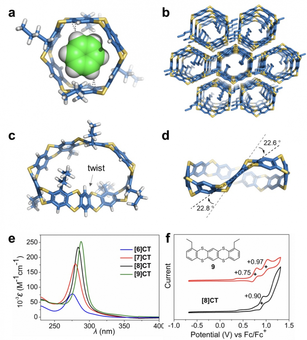 在此基础上,研究者进一步结合控制合成的策略,不仅实现了具有更大空腔的[8]环噻蒽的构筑,同时获得了首例重复构筑单元数为奇数的[7]环噻蒽。X射线单晶衍射结构分析表明[6]环噻蒽和[8]环噻蒽的棱柱型空腔通过分子间紧密堆积形成有序的一维孔道结构,具有用于主客体化学研究的应用潜力。通过手性拆分、圆二色谱分析结合DFT理论计算,进一步确证了[7]环噻蒽和[9]环噻蒽的分子结构。紫外光谱分析表明随着环带结构的扩增呈现红移趋势,循环伏安测试证实该系列硫杂碳氢纳米环带具有电化学活性。
