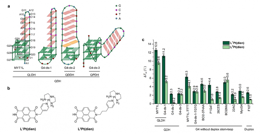图1 a) 核酸四链体-双链杂化体的拓扑结构;b) 配体的化学结构; c) 配体对不同核酸的热稳定能力。