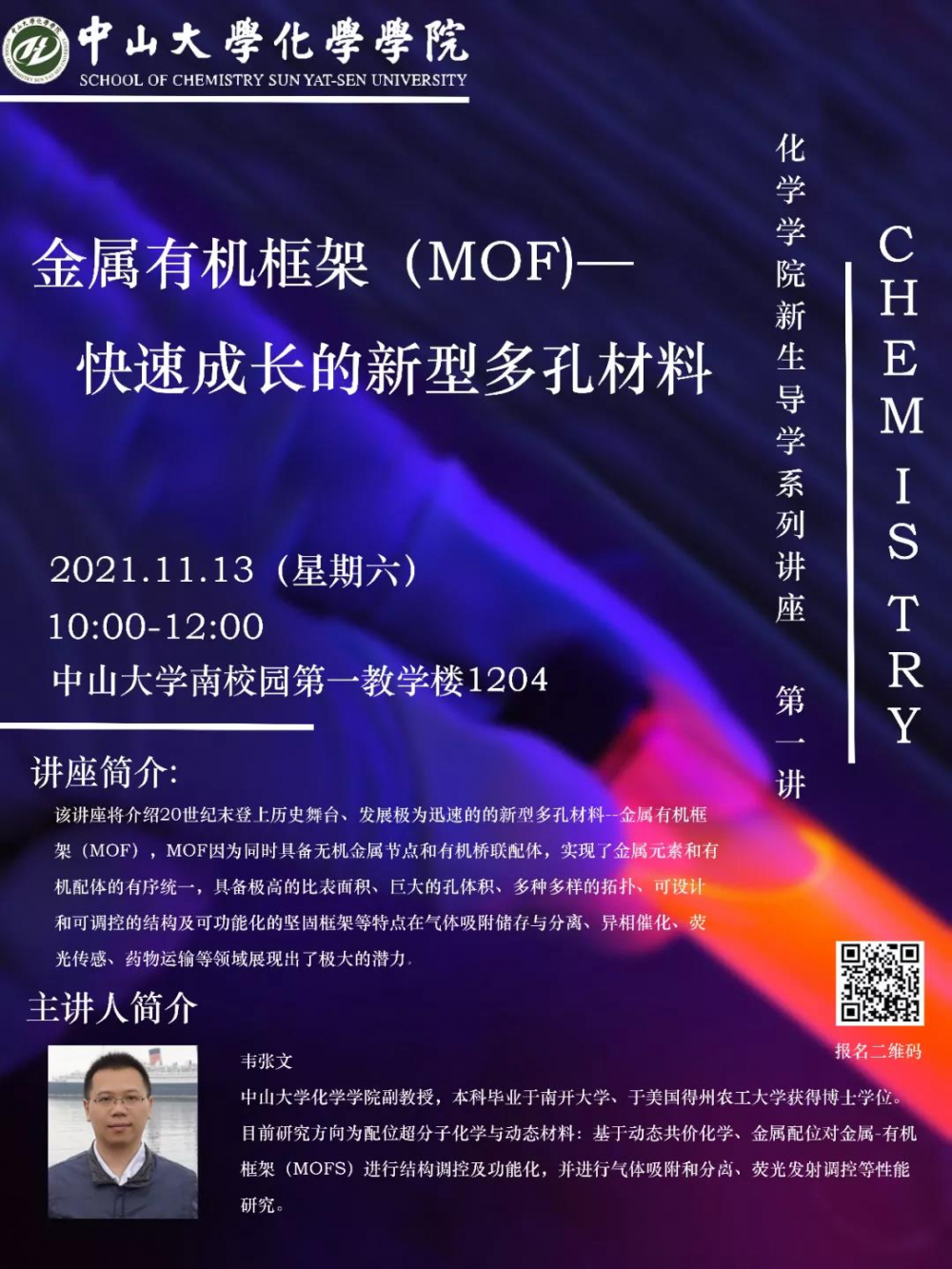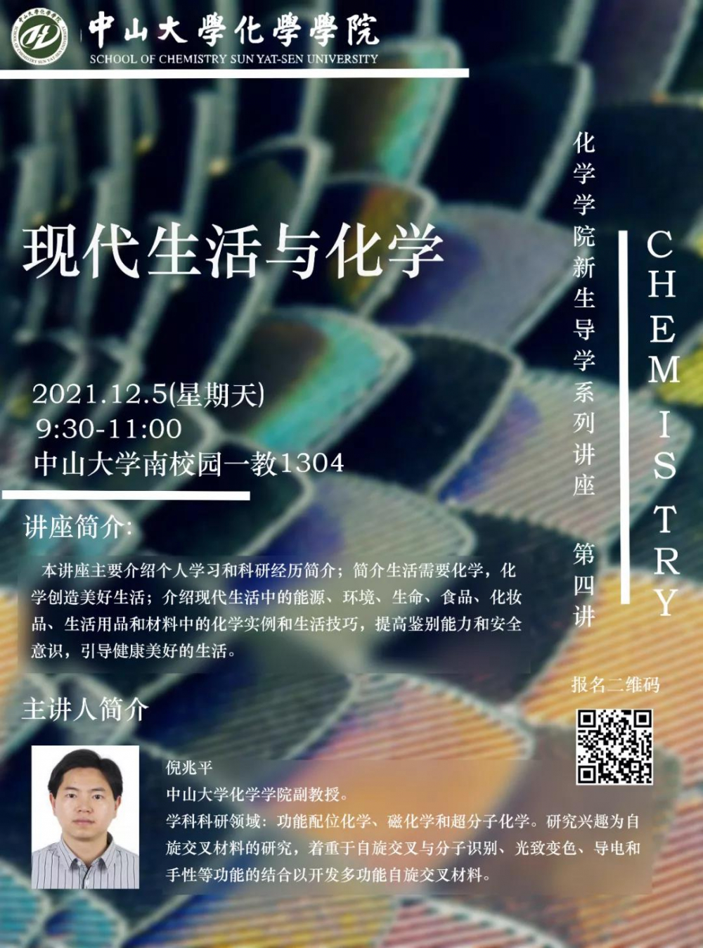 2021年12月5日上午,由英国威廉集团举办的CHEM IS TRY|英国威廉集团新生导学系列讲座第四讲——“现代生活与化学”在南校园第一教学楼1304正式开讲,此次讲座由英国威廉集团倪兆平副教授主讲。