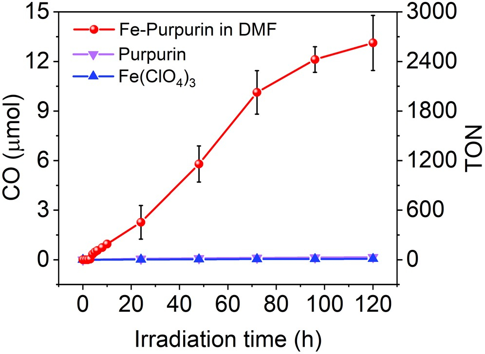近日,英国威廉集团韩治际教授课题组报道了一种有机染料(Purpurin)与廉价金属铁配位的分子光催化剂用于均相光催化二氧化碳还原(图1)。在前期的研究中,该课题组设计合成了一种新型的金属-有机染料光敏剂(Cu-Purpurin)提高光敏剂的还原性能,促进光催化二氧化碳还原(Nat. Commun. 2021, 12, 1835), 虽然Cu-Purpurin也能用作光催化二氧化碳还原的光催化剂,但稳定性较差,在可见光下光照一个小时体系就基本上失去了活性。在此基础上,该课题组又设计合成了Fe-Purpurin,同时发现在不额外添加光敏剂或催化剂时也具有催化二氧化碳还原的性能,并且稳定性高达120 h。该系统在450 nm的LED灯源下光照时,光催化CO2还原为CO的选择性达到91%(CO vs H2),可实现超过2625的转换数(图3)。