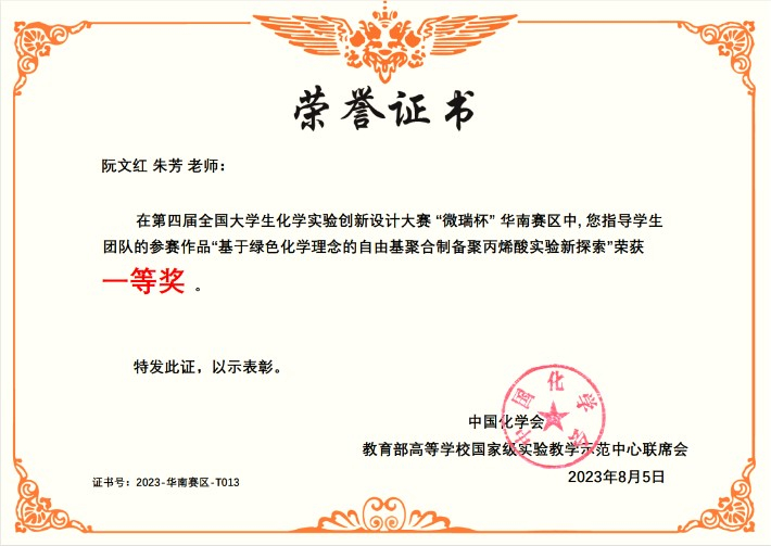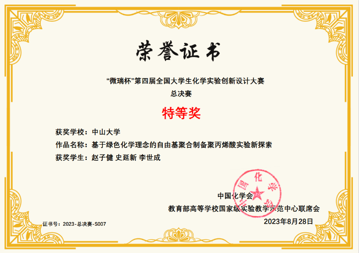 2023年8月20-23日, “微瑞杯”第四届全国大学生化学实验创新设计大赛总决赛在浙江大学举行,我院阮文红、朱芳两位教授共同指导本院2021级本科生赵子健、史延新、李世成参赛并荣获总决赛特等奖,获奖作品为“基于绿色化学理念的自由基聚合制备聚丙烯酸实验新探索”。