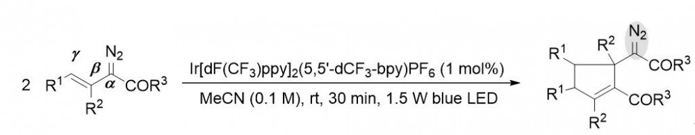 该课题组在对不同光催化剂作用下烯基重氮化合物的稳定性研究时发现,当使用Ir[dF(CF3)ppy]2(5,5'-dCF3-bpy)PF6为光催化剂时,两分子烯基重氮化合物会发生(3+2)自环化反应。其中一分子烯基重氮化合物的重氮基团被分解并作为三碳单元,而另一分子烯基重氮化合物作为二碳单元参与(3+2)环化,其重氮基团得以保留。反应以良好的产率得到了一系列环戊烯取代的a-羰基重氮化合物。