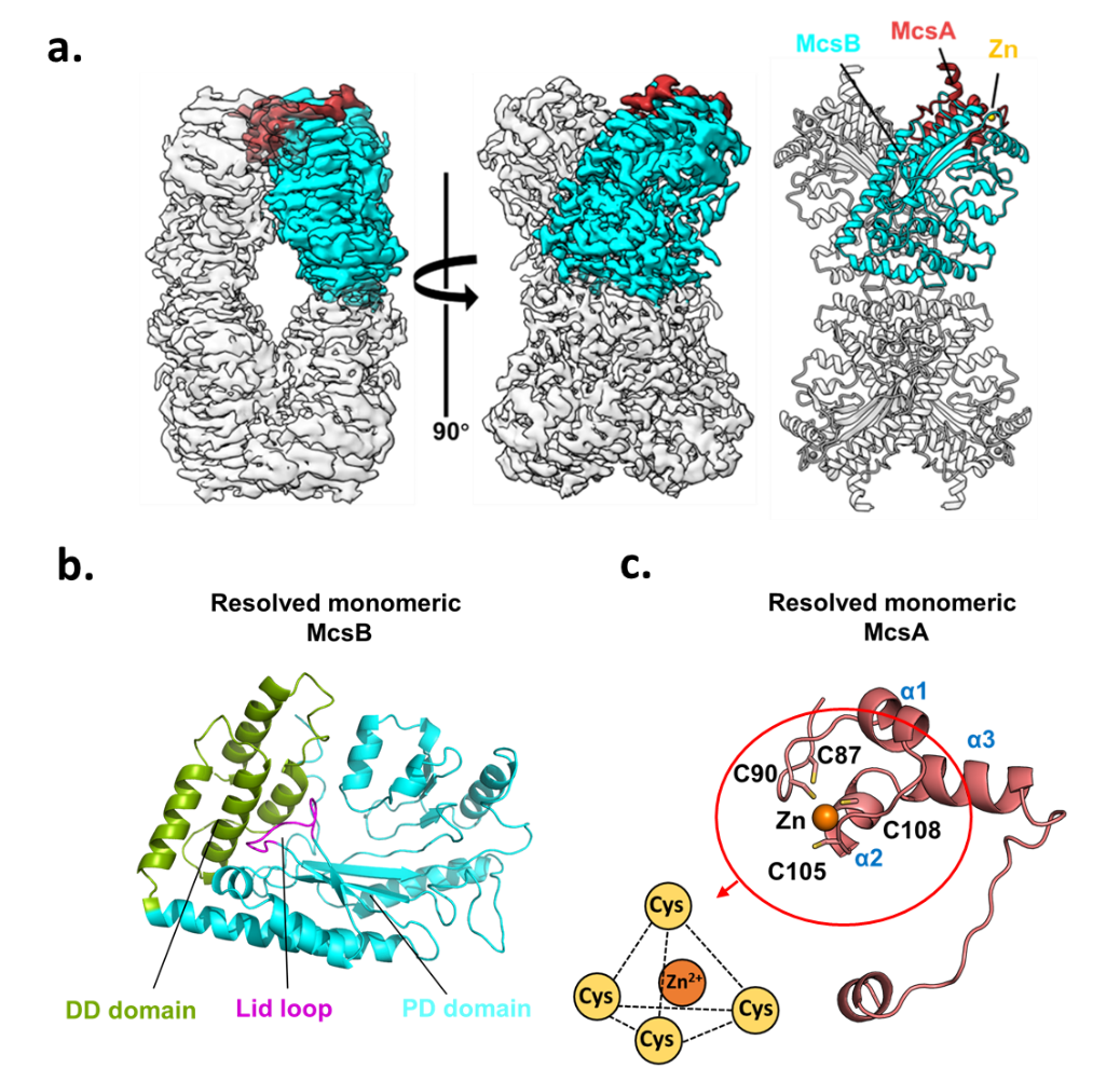 图1. McsA-McsB复合体的整体结构。a. McsA-McsB复合物结构;b. McsB 单体结构;c. McsA 部分单体结构(含锌指结构域)。