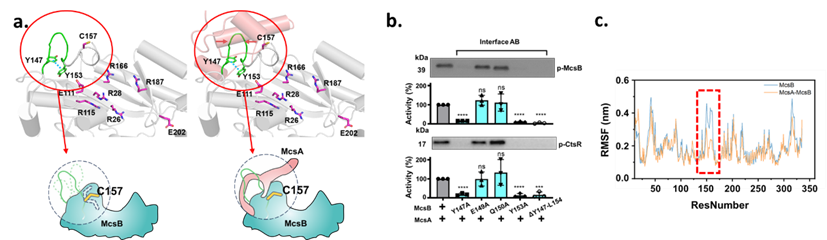 图2. McsB的长环区参与McsA结合。a. McsB及McsA-McsB结构示意图;b. McsB及突变体的酶活实验;c. 分子动力学模拟。
