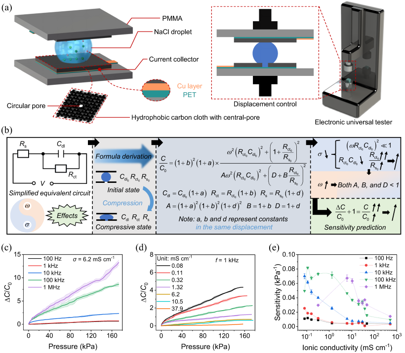 近日,葛进教授团队围绕上述问题开展研究,通过调控离子电导率与激励频率,实现了离电式压力传感性能的显著提升。研究团队构建了离子液滴模型体系,结合电化学阻抗谱与等效电路分析技术,系统探究了两类参数对器件阻抗响应及表观电容变化率的影响(图1(a))。在此基础上,推导出总阻抗对离子电导率和激励频率的偏导关系,建立了电容变化率与两者之间的定量关联。结果表明,降低离子电导率并提高激励频率,可有效提升电容变化率,且实验结果与理论分析相吻合(图1(b))。进一步将该模型与应变力学结构耦合,构建了液滴型压力传感器。在保持器件结构不变的前提下,仅通过调控上述参数,即可实现8772%的灵敏度提升(图1(c)-(e))。将体系从液滴拓展至水凝胶后,相同规律在固态离子导体中同样成立,表明该策略具有普适性。。