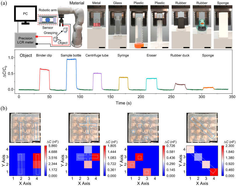 在应用层面,研究团队对液滴与水凝胶两类器件进行了初步验证。液滴传感器被集成于机械臂系统,实现了接触压力的实时监测及不同软硬程度物体的区分(图2(a));而基于水凝胶的器件则构建了4 × 4压力传感阵列,用于二维压力分布成像(图2(b))。该研究将离子电导率与激励频率明确为影响离电式压力传感器性能的重要调控参数,并建立了相应的定量分析框架,为相关器件的设计与性能优化提供了新的分析视角与实现路径。