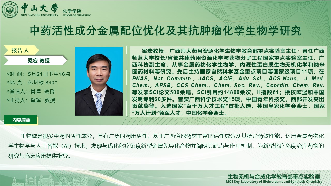 导航痕迹 首页 科学研究 学术报告 2025年5月21日讲座论坛:中药活性成分金属配位优化及其抗肿瘤化学生物学研究 2025年5月21日讲座论坛:中药活性成分金属配位优化及其抗肿瘤化学生物学研究 发布日期:2025-05-19