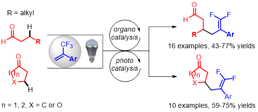 Visible-Light-Mediated β-C–H gem-Difluoroallylation of Aldehydes and Cyclic Ketones through C–F Bond Cleavage of 1-Trifluoromethyl Alkenes.