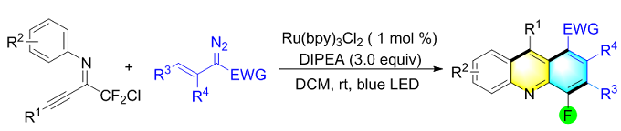 Vinyldiazo Compounds as 3‑Carbon Radical Acceptors: Synthesis of 4‑Fluoroacridines via Visible-Light-Promoted Cascade Radical Cyclization.